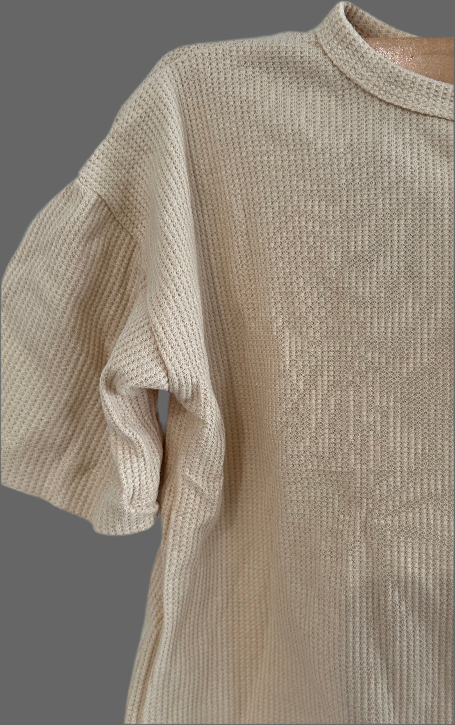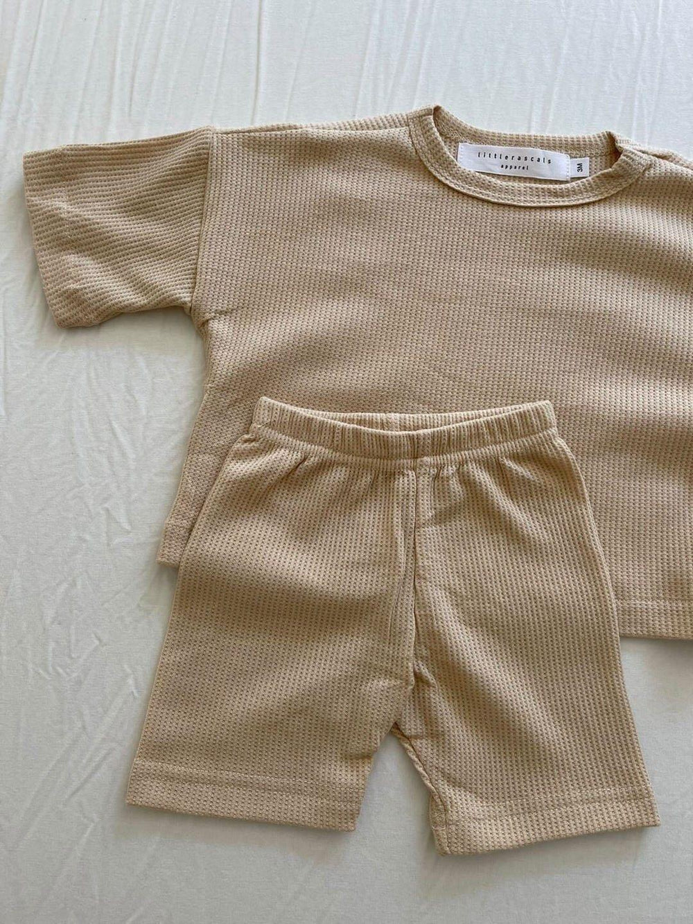 Soft, breathable waffle fabric. Includes short-sleeve oversized top & elastic-waist shorts.